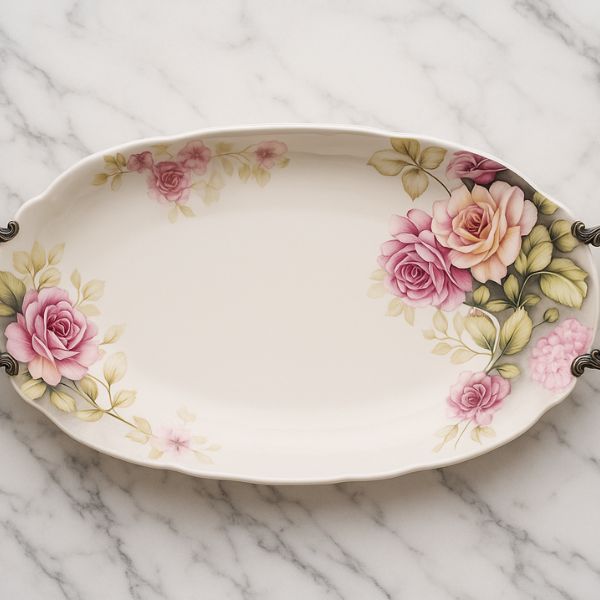 Add a touch of vintage charm to your table setting with this exquisite 21×12″ Floral Ceramic Printed Platter. Beautifully crafted from premium ceramic, it showcases a soft pastel floral design with blooming roses, bringing timeless elegance to any occasion. The platter is complemented by intricately designed antique-style metal handles, ensuring both style and convenience when serving. Ideal for presenting appetizers, desserts, or as a stunning decorative accent for your dining or living space. A perfect blend of artistry and functionality, this piece also makes a thoughtful gift for weddings, anniversaries, or festive celebrations.